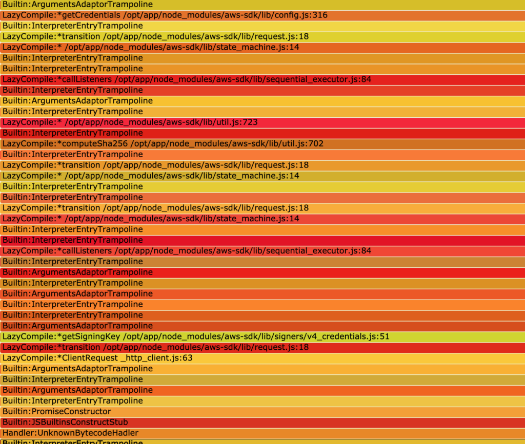 This is a callstack made to aws-sdk. Examining the callstack top to bottom won’t show any functions from my source code. In such cases it was necessary for me to understand the sourcecode i’m profiling