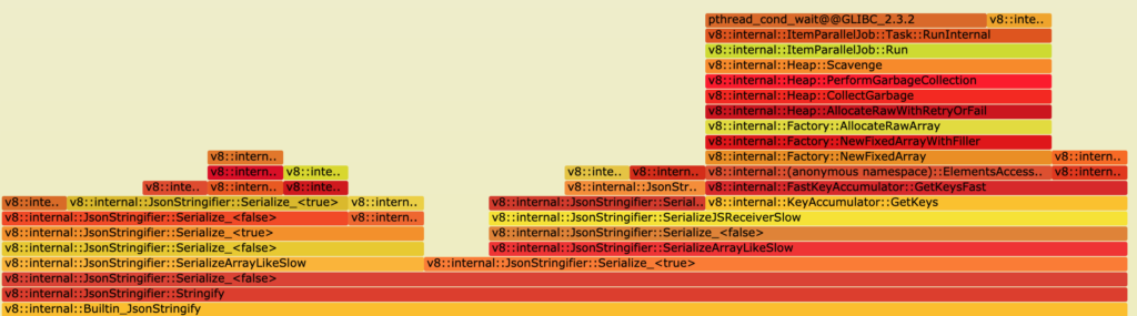 This exact callstack was distributed all over the flamegraph that i generated. After eliminating all of the calls to JSON.parse and JSON.stringify the response time of the service increased drastically.